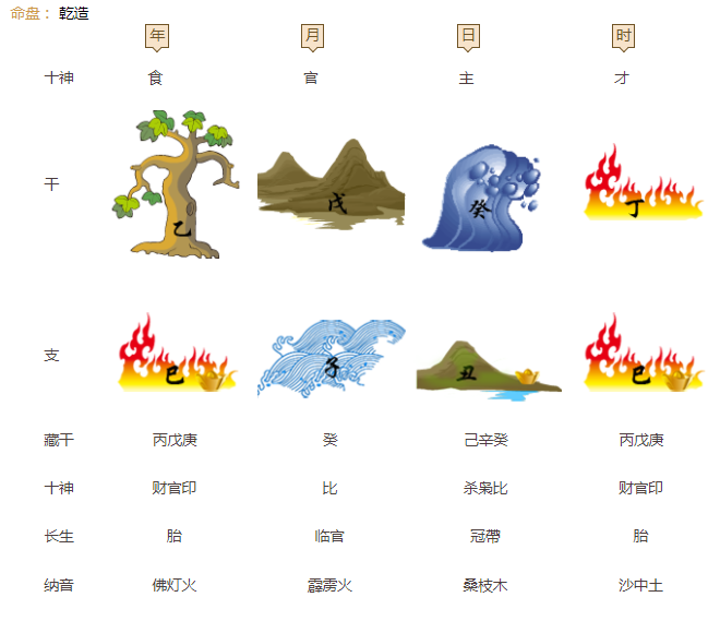 与年柱乙巳组合上,天干乙木克戊土,阴木克阳土,克之不力;地支则构成子水和巳火既济的局面。